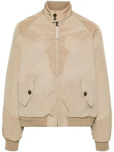 beige stand-up collar long sleeves ribbed cuffs and hem two side flap pockets signature four-stitch logo internal locker loop internal logo tag full lining straight hem front zip fastening