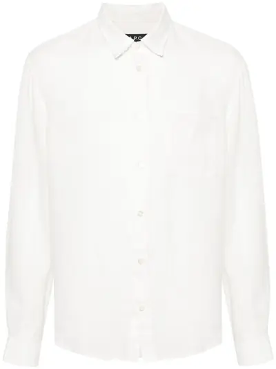 ivory white linen/flax chambray classic collar long sleeves buttoned cuffs chest patch pocket embroidered logo at the chest internal logo tag curved hem front button fastening