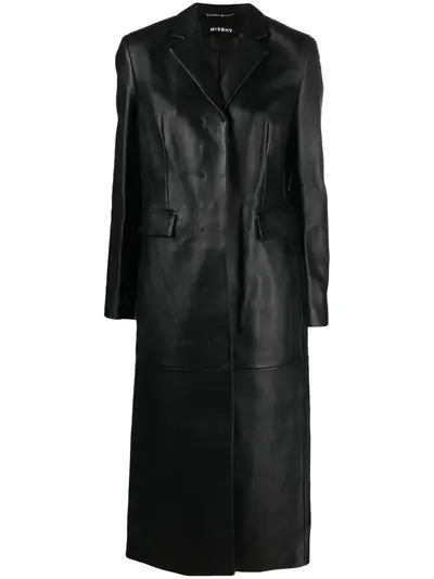 jet black calf leather notched lapels concealed front fastening long sleeves two side flap pockets rear slit straight hem MISBHV does not include brand tags on hats, jewellery and bags from their SS21 collection to ensure your piece arrives in perfect condition.