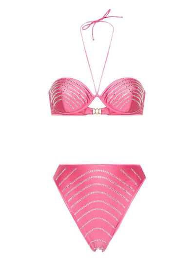flamingo pink stretch-design high-shine finish crystal embellishment Top: balconette style halterneck tie fastening rear clasp fastening Bottoms: high-waisted high cut Be mindful to try on swimwear over your own garments.
