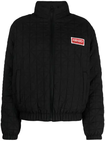 black duck down quilted high neck logo patch at the chest front zip fastening long sleeves elasticated cuffs two side welt pockets elasticated hem