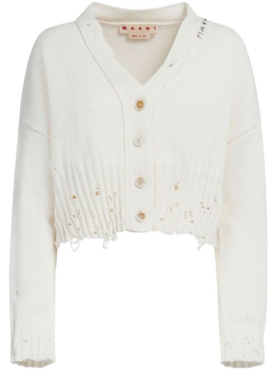 ivory white cotton ribbed knit distressed finish embroidered logo ribbed V-neck drop shoulder long sleeves ribbed cuffs and hem cropped