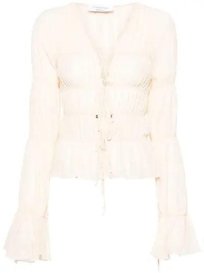 beige semi-sheer construction tiered design pleat detailing V-neck front tie fastening long bell sleeves tied cuffs ruffle hem