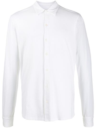 White stretch cotton shirt from Majestic Filatures featuring a pointed collar, a front button placket and long sleeves.