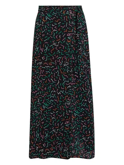 black/multicolour all-over graphic print wrap design side tie fastening straight hem long length