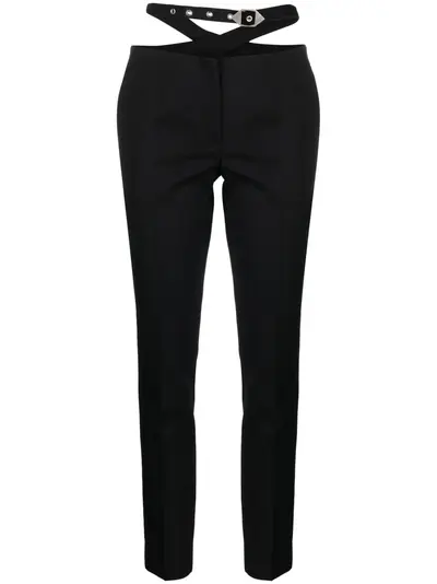 black virgin wool twill weave logo buckle-fastening waist strap pressed creases low-rise slim cut concealed front fastening two side slash pockets two rear jetted pockets
