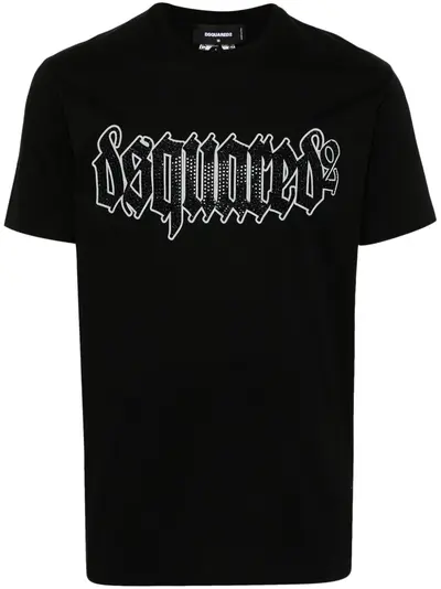 black cotton jersey texture crew neck short sleeves logo print to the front with rhinestone embellishment straight hem