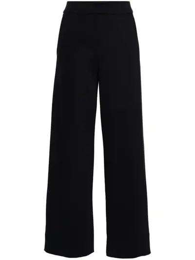 navy blue jersey texture two side inset pockets wide leg concealed front button, hook and zip fastening