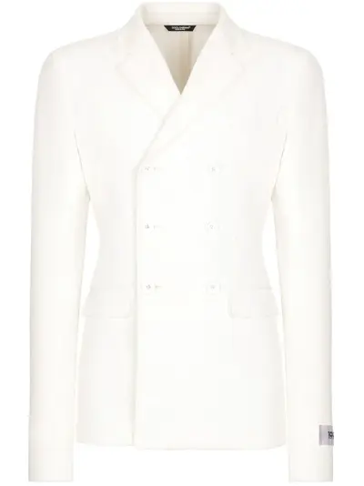 optical white crepe texture notched lapels double-breasted button fastening long sleeves buttoned cuffs chest welt pocket two front flap pockets American rear vent straight hem