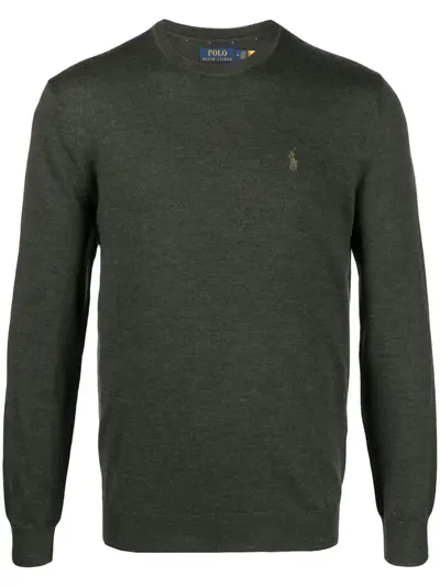 olive green wool fine knit ribbed-knit edge signature Polo Pony motif embroidered logo at the chest crew neck long sleeves ribbed cuffs and hem