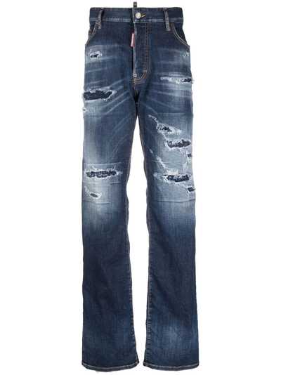 indigo blue stretch-cotton denim faded effect ripped detailing logo patch to the rear straight leg mid-rise concealed fly and button fastening belt loops classic five pockets