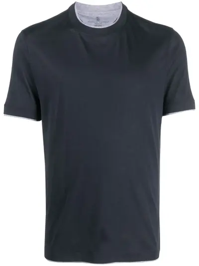 cobalt blue/heather grey cotton-silk blend jersey texture contrasting border crew neck short sleeves contrasting cuffs and hem straight hem