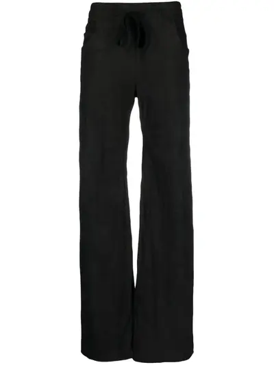 black leather elasticated drawstring waistband straight leg two diagonal pockets to the sides straight hem