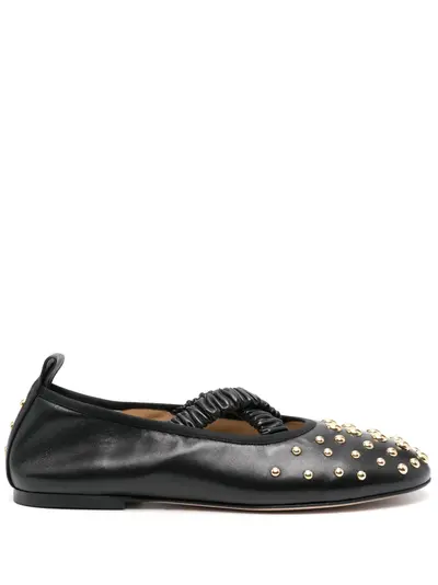 black lambskin gold-tone stud embellishment crossover strap detail round toe elasticated straps slip-on style pull-tab at the heel branded leather insole flat leather sole
