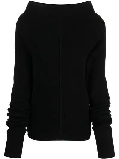 black wool-cashmere blend ribbed knit vertical seamed boat neck drop shoulder long sleeves ribbed hem