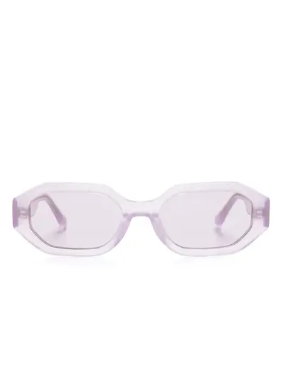 lilac purple acetate geometric frame purple tinted lenses transparent design logo plaque at the arm straight arms curved tips These glasses come with a protective case.