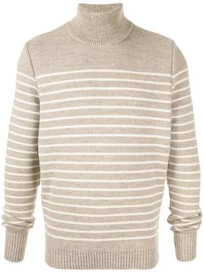 Neutral wool blend striped roll neck jumper from Fumito Ganryu featuring ribbed trimming and a knitted style.