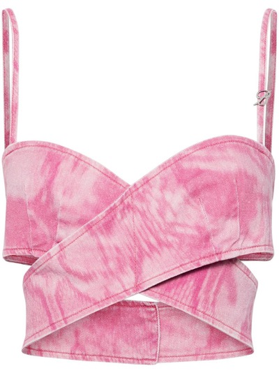 pink stretch-cotton denim tie-dye pattern crossover strap detail cut-out detailing silver-tone logo plaque sweetheart neck rear press-stud fastening spaghetti straps cropped