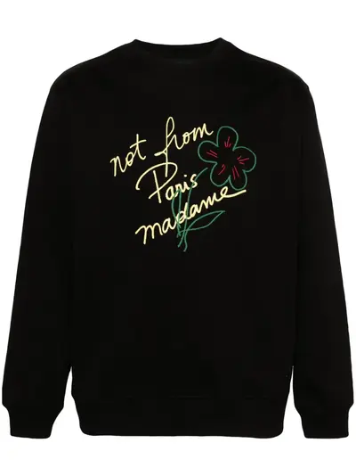black cotton jersey texture slogan print to the front floral embroidery to the front crew neck drop shoulder long sleeves ribbed cuffs and hem