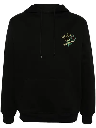 black cotton jersey texture slouchy hood embroidered 'Not From Paris Madame' motif front pouch pocket drop shoulder long sleeves ribbed cuffs and hem French terry lining