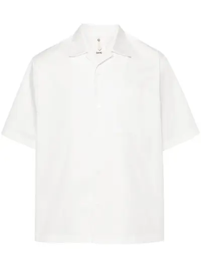 white poplin texture classic collar tonal embroidered logo at the chest chest patch pocket short sleeves graphic-print patch to the rear straight hem front button fastening