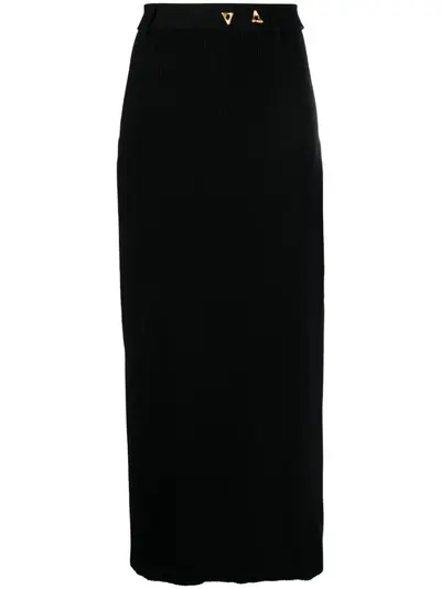 black FSC viscose blend ribbed knit gold-tone hardware high waist belted waist rear slit pencil silhouette straight hem