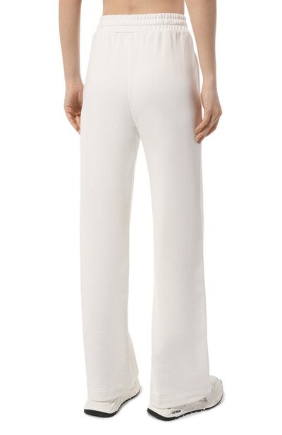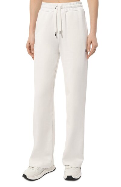 Белые брюки, представленные эксклюзивно в ЦУМе, подружатся и с яркими вещами, и с одеждой в сдержанной гамме. Для пошива прямой модели с регулируемым широким поясом-кулиской, обеспечивающим удобную посадку на талии, использовали хлопковый трикотаж, не сковывающий движения. Принадлежность изделия бренду Доменико Дольче и Стефано Габбана деликатно обозначили миниатюрной серебристой монограммой DG сбоку.