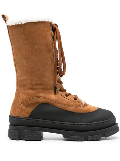 camel brown/black calf suede silver-tone logo plaque faux-shearling lining pull-tab at the heel round toe front lace-up fastening branded leather insole ridged rubber sole
