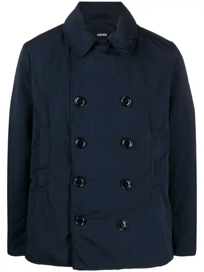 navy blue spread collar double-breasted button fastening long sleeves two side inset pockets straight hem