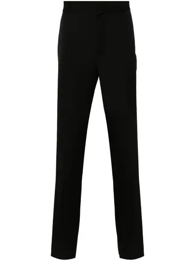 black wool grain de poudre concealed front fastening belt loops two diagonal pockets to the sides pressed crease two rear button-fastening jetted pockets tapered leg