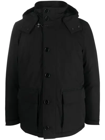 black feather down stretch-design slouchy hood stand-up collar front button fastening two chest welt pockets front flap pockets long sleeves straight hem