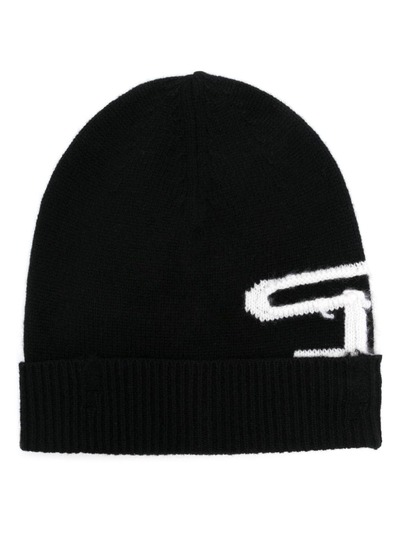 black/white wool fine knit turn-up brim intarsia-knit logo ribbed edge pull-on style