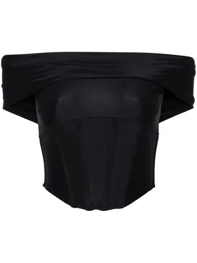 black/grey stretch-design corset style off-shoulder short sleeves rear zip fastening boned bodice high-low hem
