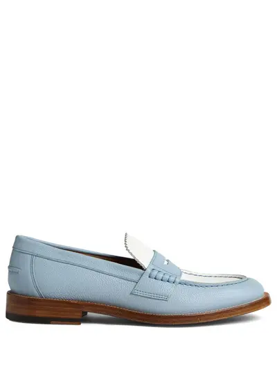 light blue and white calf leather two-tone design zigzag edge almond toe penny slot slip-on style logo print to the rear branded insole low stacked heel