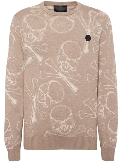 beige/ecru cotton jacquard skull motif appliqué logo logo tag crew neck long sleeves ribbed cuffs and hem