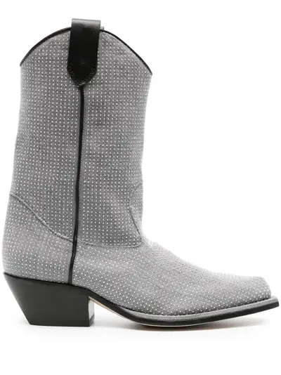 light grey stud embellishment double pull-tab at the opening ankle-length slip-on style pointed toe branded leather insole low block heel leather outsole