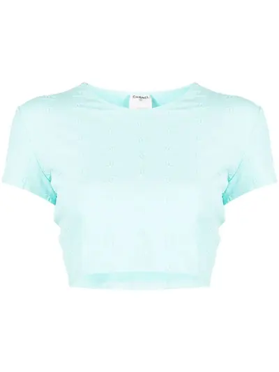 circa 1997 light blue stretch-design round neck signature interlocking CC logo short sleeves straight hem cropped Condition: GOOD. This previously owned and used item is in good condition with minimal signs of use. This may include fading of material or plating and scratches.