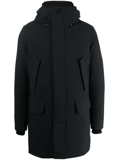 black recycled polyester/recycled nylon drawstring hood concealed front fastening long sleeves four front flap pockets mid-length straight hem