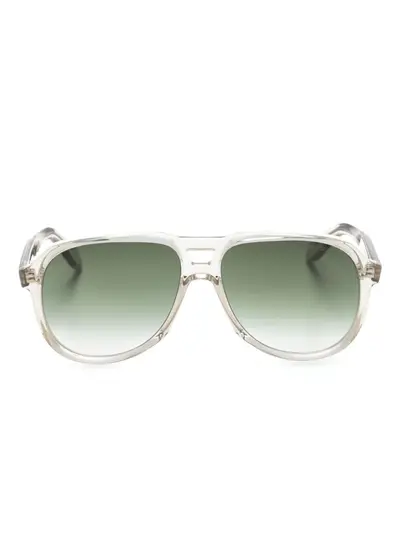light beige acetate transparent design gold-tone logo lettering gold-tone hardware gradient lenses navigator frame straight arms curved tips These glasses come with a protective case.