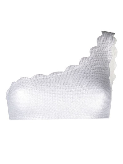 silver-tone stretch-design textured finish metallic finish scallop edge asymmetric neck rear clasp fastening one-shoulder elasticated underband Be mindful to try on swimwear over your own garments.