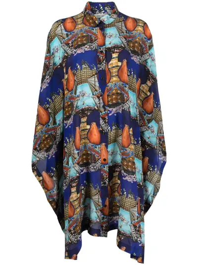 multicolour crepe texture collage print Peter Pan collar drop shoulder long draped sleeves buttoned cuffs detachable waist belt side slits handkerchief hem mid-length front button fastening