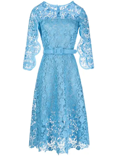 blue silk floral-lace detailing cut-out detailing detachable and adjustable waist belt round neck concealed rear zip fastening three-quarter length sleeves mid-length full lining
