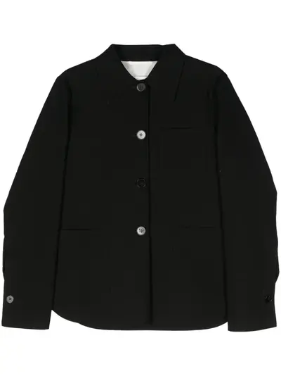 black cotton twill weave classic collar long sleeves with buttoned cuffs chest patch pocket two side patch pockets curved hem front button fastening