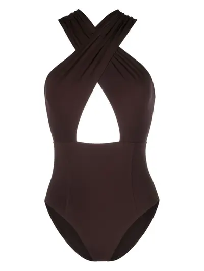 brown stretch-design plunge style ruched detailed shoulder straps sleeveless low back crossover strap detail to the rear high cut full lining Be mindful to try on swimwear over your own garments.
