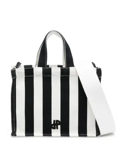 white/black cotton canvas vertical stripe print appliqué logo open top detachable jacquard shoulder strap two flat top handles main compartment internal logo tag unlined gold-tone hardware
