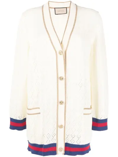 ivory white bright red navy blue cotton pointelle knit metallic threading front button fastening long sleeves striped edge ribbed cuffs and hem straight hem