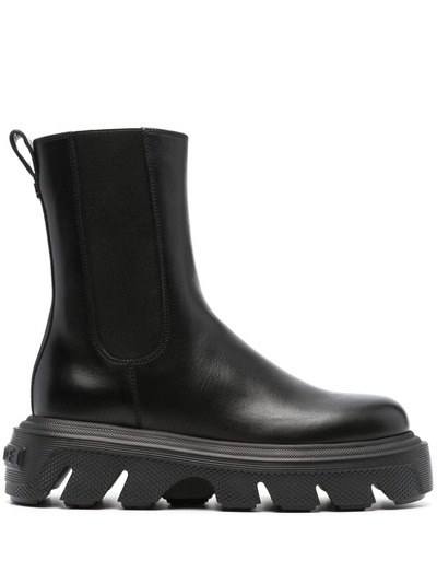 jet black calf leather smooth grain embossed logo to the rear elasticated side panels pull-tab at the heel round toe pull-on style branded leather insole segmented rubber sole ankle-length