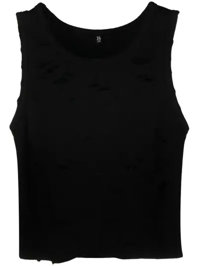 black cotton ribbed knit ripped detailing scoop neck sleeveless straight hem cropped
