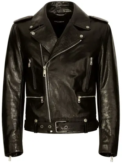 black lambskin grained texture notched collar rivet detailing epaulettes off-centre front zip fastening multiple zip-fastening pockets long sleeves cuff zips belted waist silver-tone hardware straight hem
