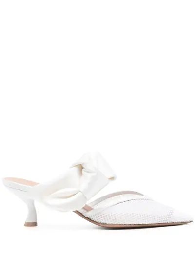white calf leather satin finish/mesh panelling semi-sheer construction pointed toe strap detailing to the front bow detailing to the side branded leather insole 45mm low heel leather sole slip-on style This piece comes complete with a protective dust bag.